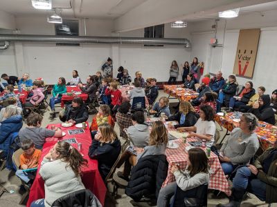 On Thursday, December 14, The Sharon Academy middle school students, their parents, and school staff gathered in the Middle School basement to share a meal of Cockadoodle Pizza and to celebrate student work in progress as well as the art and ethos of rehearsal. The evening examined Romeo and Juliet as a foundation for discussions on our year-long focus on human rights, which includes the theme of justice.